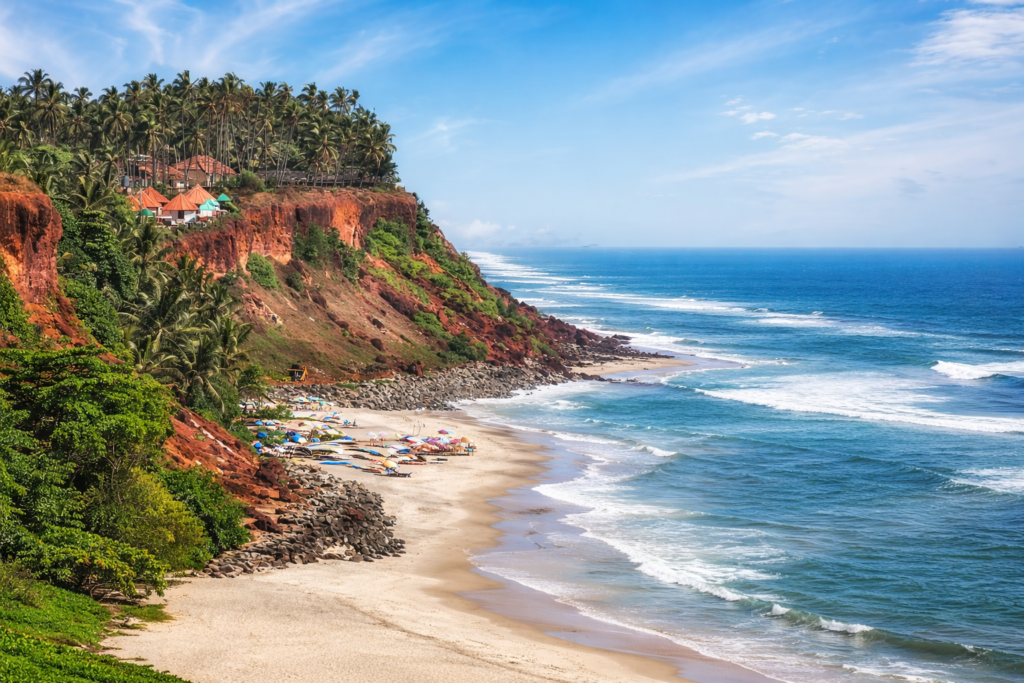 Varkala is a unique beach town in South Kerala. What makes it special is the huge red cliff that stands right next to the Arabian Sea. There are many small shops and cafes on top of the cliff where you can sit and look at the blue ocean. Varkala Beach is also called Papanasam Beach because people believe the water can wash away sins. It is a great place for swimming, sunbathing, and practicing yoga. The vibe here is very relaxed and friendly, making it a favorite spot for travelers from all over the world.