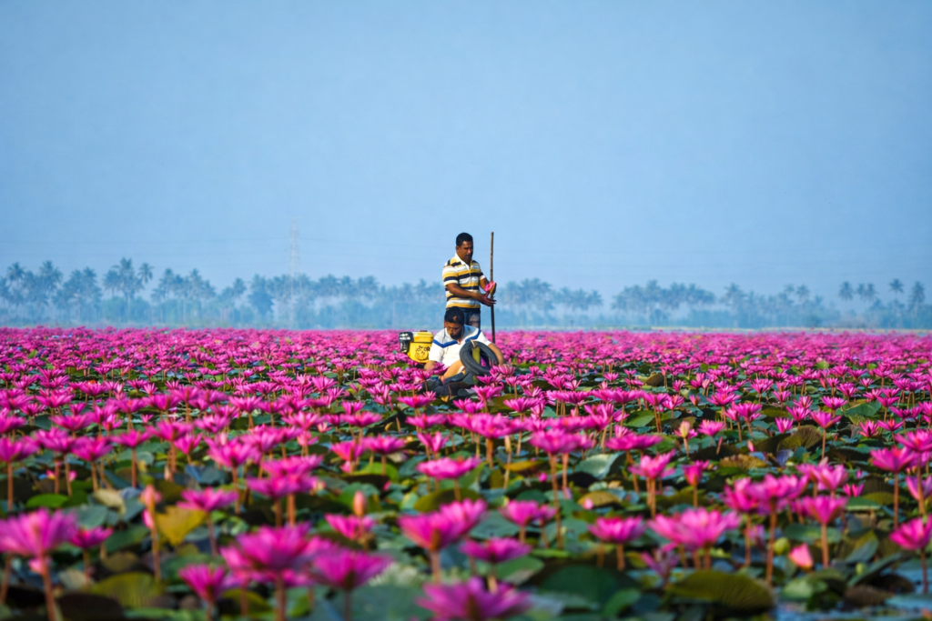 Malarikkal is a seasonal wonder that has recently become a favorite for photographers and nature lovers. During the blooming season, hundreds of acres of paddy fields are covered in thousands of pink water lilies. To see this spectacle, you must wake up early; at sunrise, the fields look like a sea of pink. It is a simple, rustic village experience that feels like stepping into a painting.