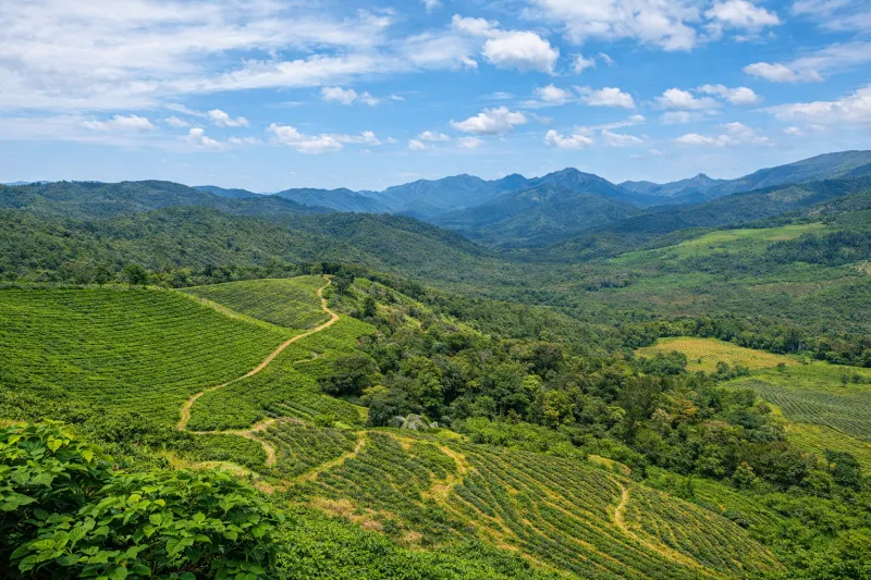 From the hilltop, you get clear views of nearby hills, tea gardens, and open sky.